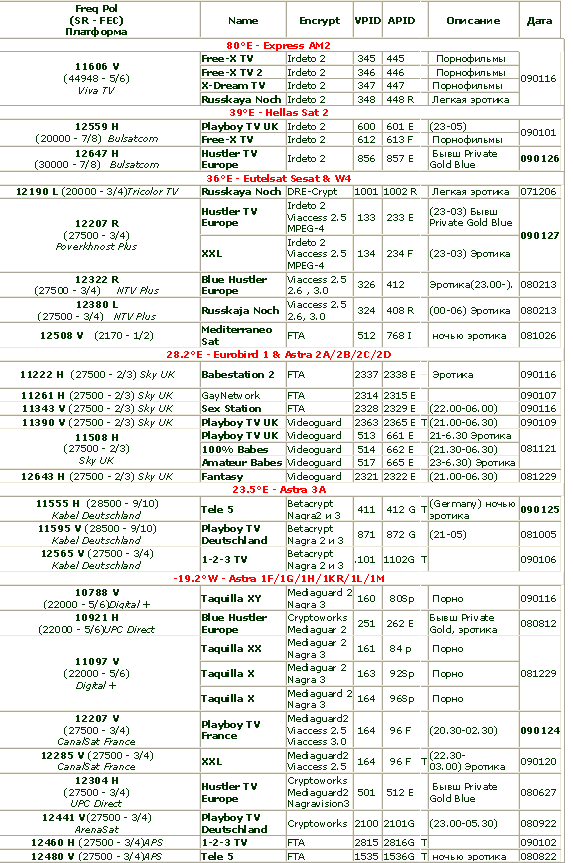 މިހާރު ކޮމްޕްރެޝަން ޓެކްނޮލޮޖީގެ ސަބަބުން ޓްރާންސްމިޝަން ޗެނަލްތަކުގެ އަދަދު ވަނީ ވަރަށް ބޮޑަށް އިތުރުވެފައެވެ. މިގޮތުން މިއަދު އެއް އޯބިޓަލް ޕޮޒިޝަނުން އެތައް ސަތޭކަ ބޮޑެތި މީހުންނަށް ހިލޭ އަދި މުސާރަ ލިބޭ ޓީވީ ޗެނަލްތަކެއް ލިބިދާނެއެވެ. 18+ ޗެނަލްތައް ޓްރާންސްޕޯންޑަރުންނާއި ފްރީކުއެންސީތަކުން ބަލާލެވޭނެ 10930/H/30000 2/3 DVB-S2 އަދި 11662/V/27500 3/4 DVB-S2 ގިނަ ފަހަރަށް ބޮޑެތި މީހުންގެ ޗެނަލްތައް ފެންނަނީ ތިރީގައިވާ ސެޓެލައިޓްތަކުން (އެންމެ ތިން ސެޓެލައިޓްތަކުންނެވެ މަޝްހޫރު) :