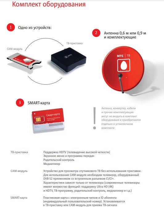 Ko’ápe ñañatende umi característica orekóva TV oîva. Peteĩ kit orekóva módulo leva iporã umi televisor orekóva receptor DVB-S2 incorporado ha oipytyvõva formato HEVC. Ambue televisor-kuérape g̃uarã, rojogua peteĩ TV set-top box MTS-gui. Pe número de módulo de leva térã umi set-top box ojoaju vaʼerã pe número de televisor ndive. Avei reikotevẽta peteĩ soporte, peteĩ cable coaxial oñembojoaju hag̃ua, umi conector 2 ° F ha ambue mbaꞌe michĩva. Opa ko’ã mba’e oike paquete básico empresa orekóva equipo de instalación.