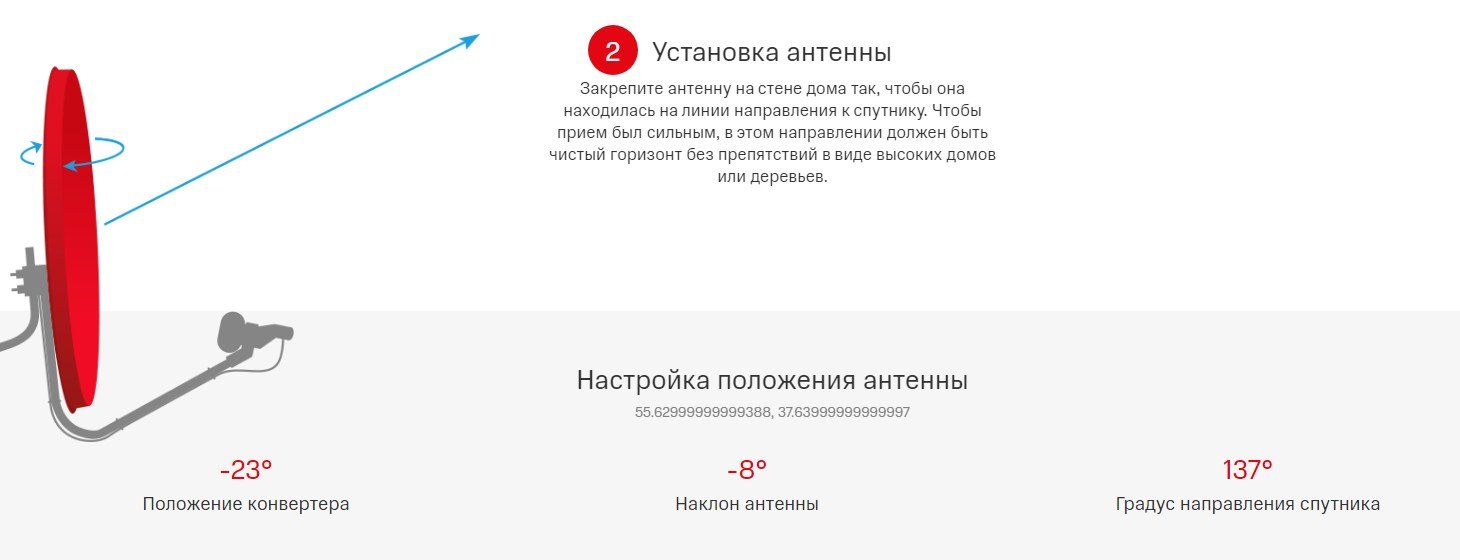 Oiporavo jave petet antena, ojesarekova era pe diámetro rehe. Hetave región-pe g̃uarã, pe diámetro iporãvéva peteĩ antena satelital rehegua haꞌehína 0,6 metro. Oñemoñe’ê umi antena orekóva diámetro 0,9 metro oñemoî haguã umi región orekóva señal ikangyvéva, techapyrã, región Kaliningrad, Primorsky Krai, República de Sakha, Yakutia ha Karelia. Ikatu avei reheja pe antena pe proveedor yma guarégui. Oñemohenda jave, suficiente ojegueraha jey ambue satélite-pe, ha oñemoambue convertidor peteĩ lineal-pe.