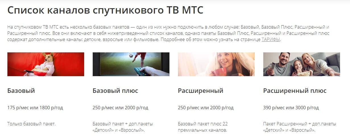 Wekî beşek televîzyona satelîtê ya ji operatorê MTS, 4 pêşniyarên pakêtê yên bingehîn hene: