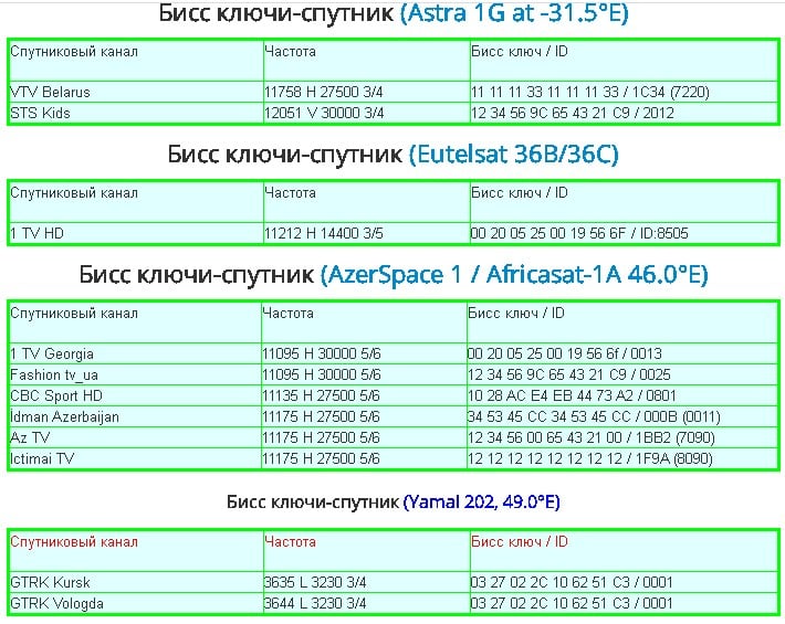 Tala mwa ba chaînes populaire na territoire ya Fédération de Russie na Ukraine, ainsi que ba clés BISS na bango. Na boumeli ya ntango, ba code oyo emonisami ekobungisa ntina na yango, mpamba te bato oyo bapesaka lisalisi bazalaka na momeseno ya kobongola yango, mpe na likambo yango ekosɛnga oluka koluka ya sika. Ba clés BISS ezali surtout populaire na territoire ya Ukraine, kasi ekangami spécifiquement te na ba états, elingi koloba que usager nionso oyo azali na code mpe accès direct na satellite akoki kotala chaîne ya télévision depuis mboka mosusu.